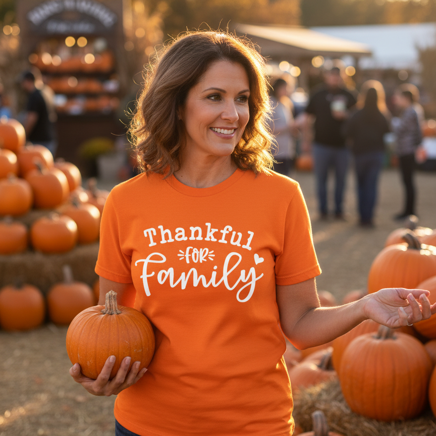 This tee is basically autumn wrapped in cotton. Bright pumpkin-orange, soft-as-a-hug fabric, and the sweetest reminder of what really matters: family. It’s the perfect feel-good shirt for pumpkin patches, Thanksgiving gatherings, fall festivals, or those cozy days when you want your outfit to preach gratitude without you saying a word.